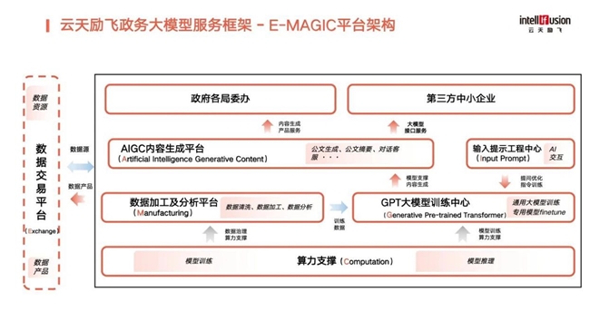 云天勵飛提出“E-MAGIC”政務(wù)大模型服務(wù)框架,集成數(shù)據(jù)交易平臺、AIGC內(nèi)容生成平臺、數(shù)據(jù)加工及分析平臺、GPT大模型訓(xùn)練中心、輸入提示工程中心和算力支持六大核心組件,利用前沿的AI技術(shù)和大數(shù)據(jù)處理能力,為政府部門提供高效的數(shù)據(jù)服務(wù)和智能化解決方案,提升日常辦公的效率及服務(wù)質(zhì)量等。