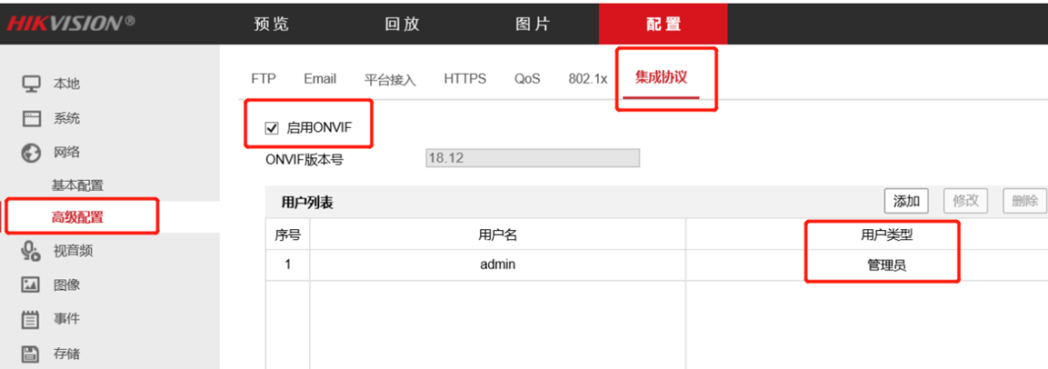 網(wǎng)絡(luò)配置---高級配置---啟用ONVIF協(xié)議或集成協(xié)議,添加管理員(與web登錄用戶名密碼一致即可)用戶,點擊保存;