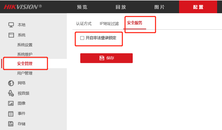 登錄海康相機web界面,配置---系統(tǒng)---安全管理---安全服務(wù),關(guān)閉非法登錄鎖定功能,點擊“保存”;