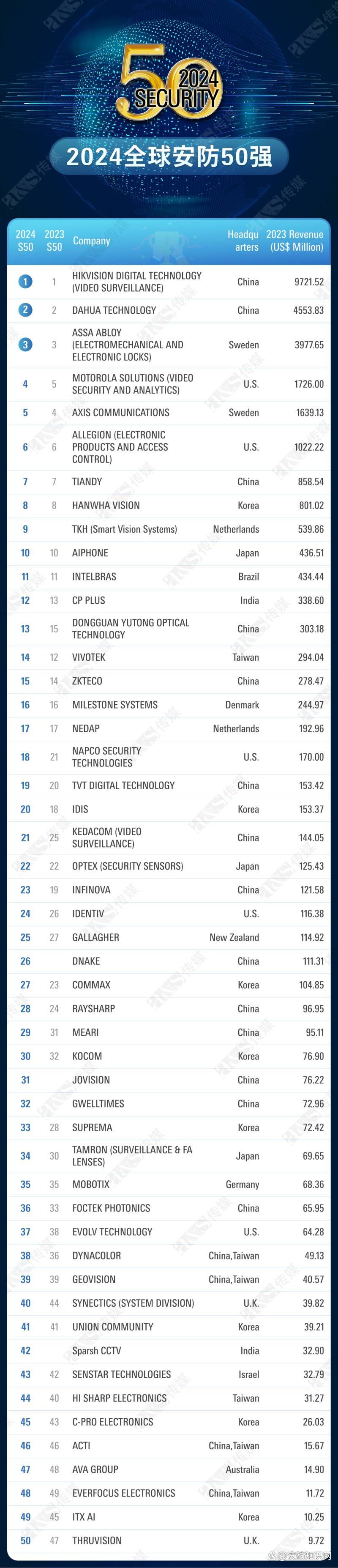 2024年全球安防50強(qiáng)榜單公布