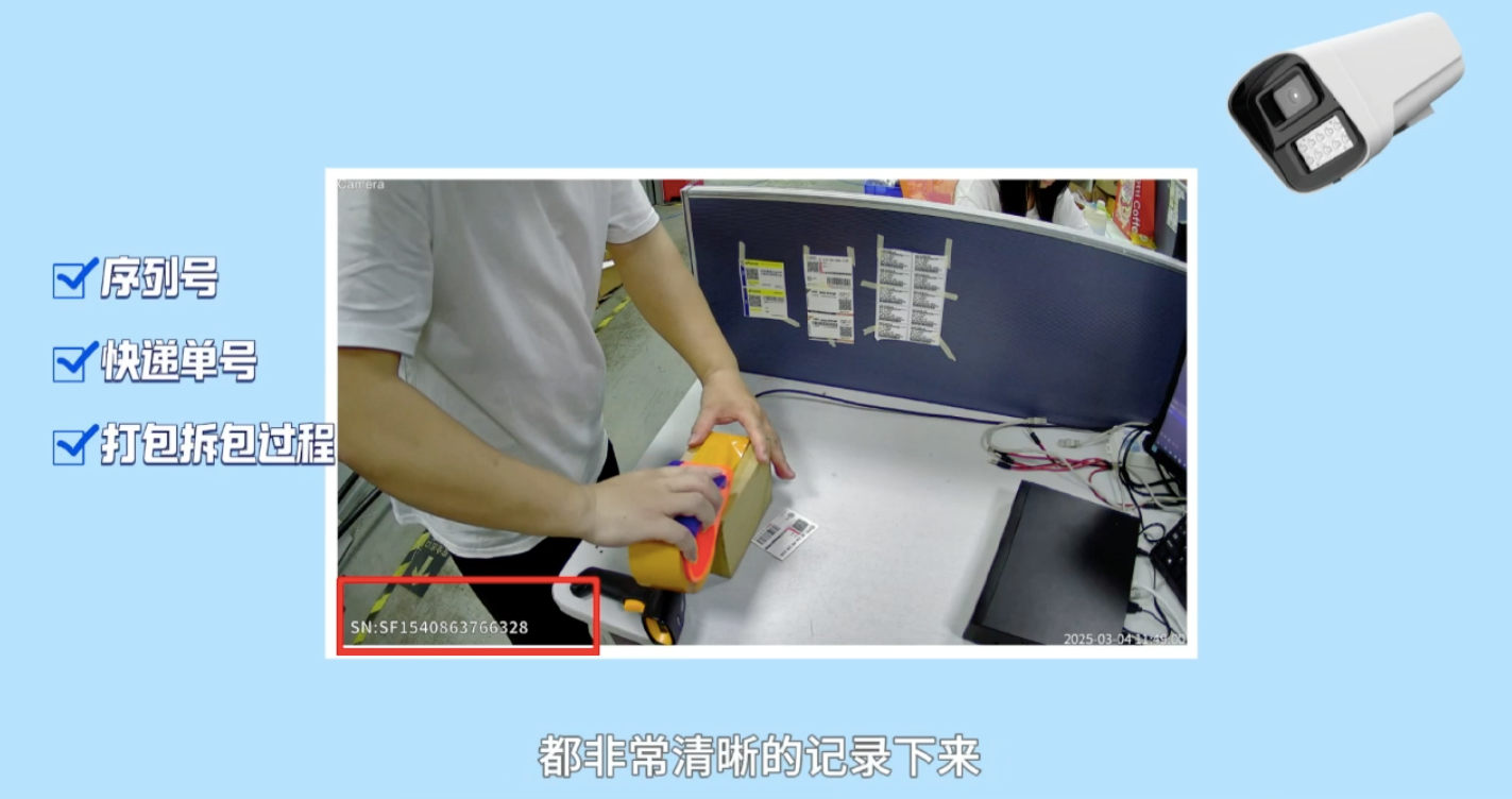 快遞打包監(jiān)控取證系統(tǒng)在流水線生產(chǎn)崗位和產(chǎn)品檢驗崗位上方部署普通的網(wǎng)絡攝像頭和掃碼槍,可通過掃碼采集產(chǎn)品條形碼數(shù)據(jù)、掃描時間節(jié)點與攝像頭采集的視頻融合,可設置掃描后需要錄像的時間,然后利用條形碼單號快速檢索對應產(chǎn)品生產(chǎn)和檢驗過程中的視頻片段,從而在面臨出現(xiàn)問題時:例如發(fā)生因質(zhì)量問題退貨時,可快速的進行產(chǎn)品可視化溯源。