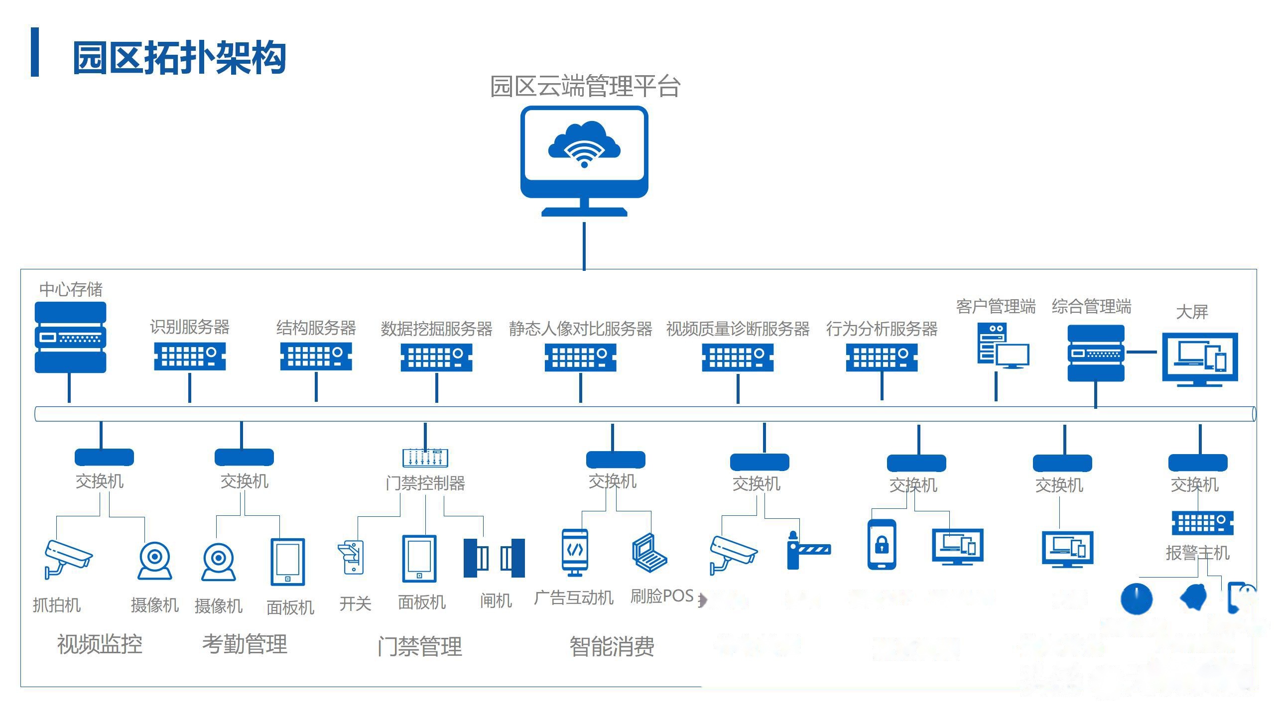 智慧園區AI智能安防監控系統采用分層架構設計,主要包括感知層、網絡層、平臺層和應用層: